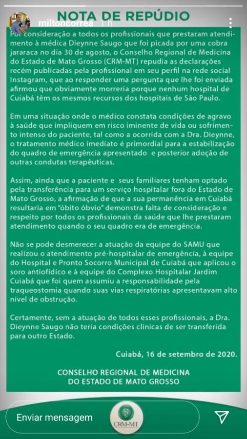 O Conselho Regional de Medicina de Mato Grosso (CRM-MT) divulgou nota de repúdio nesta quarta-feira (16), após a médica Dieyenne Saugo, que foi picada por uma jaracaca em uma cachoeira em Nobres, afirmar que morreria em Cuiabá, em decorrência da falta de recursos hospitalares na capital mato-grossense.