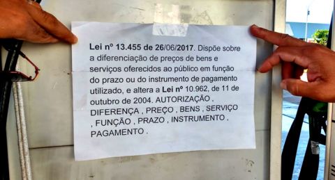 Sobre o valor diferenciado ele garante que já vinha sendo praticado há alguns dias, bem antes da greve dos caminhoneiros. E diante de questionamentos de alguns clientes, um cartaz foi afixado num local visível para alertar os consumidores que o posto pode praticar a diferenciação de preço se a venda for no crédito ou débito/dinheiro. “Lei nº 13.455 de 26/06/2017. Dispõe sobre a diferenciação de preços de bens e serviços oferecidos ao público em função do prazo ou do instrumento de pagamento utilizado, e altera a Lei nº 10.962, de 11 de outubro de 2004. Autorização, diferença, preço, bens, serviço, função, prazo, instrumento, pagamento”, diz o cartaz.
