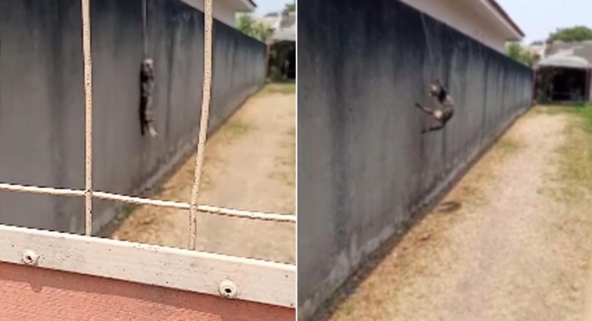 Segundo Trindade, o gato possivelmente estava andando sobre o muro e enroscou a corda em um ferro de construção, vindo a ficar pendurado na parede. O animal foi encaminhado para uma casa de abrigo.