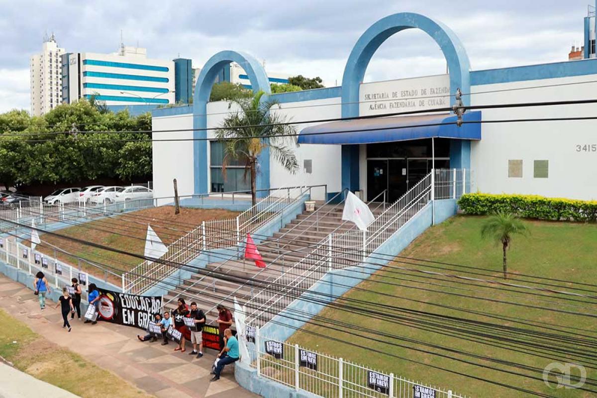 Educadores em greve bloqueiam a entrada da Secretaria de Estado de Fazenda (Sefaz) desde as primeiras horas da manhã e impedem os servidores do órgão de entrar. Por causa da manifestação, o expediente da Sefaz foi suspenso no período da manhã.
