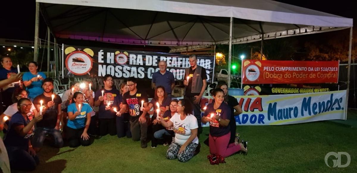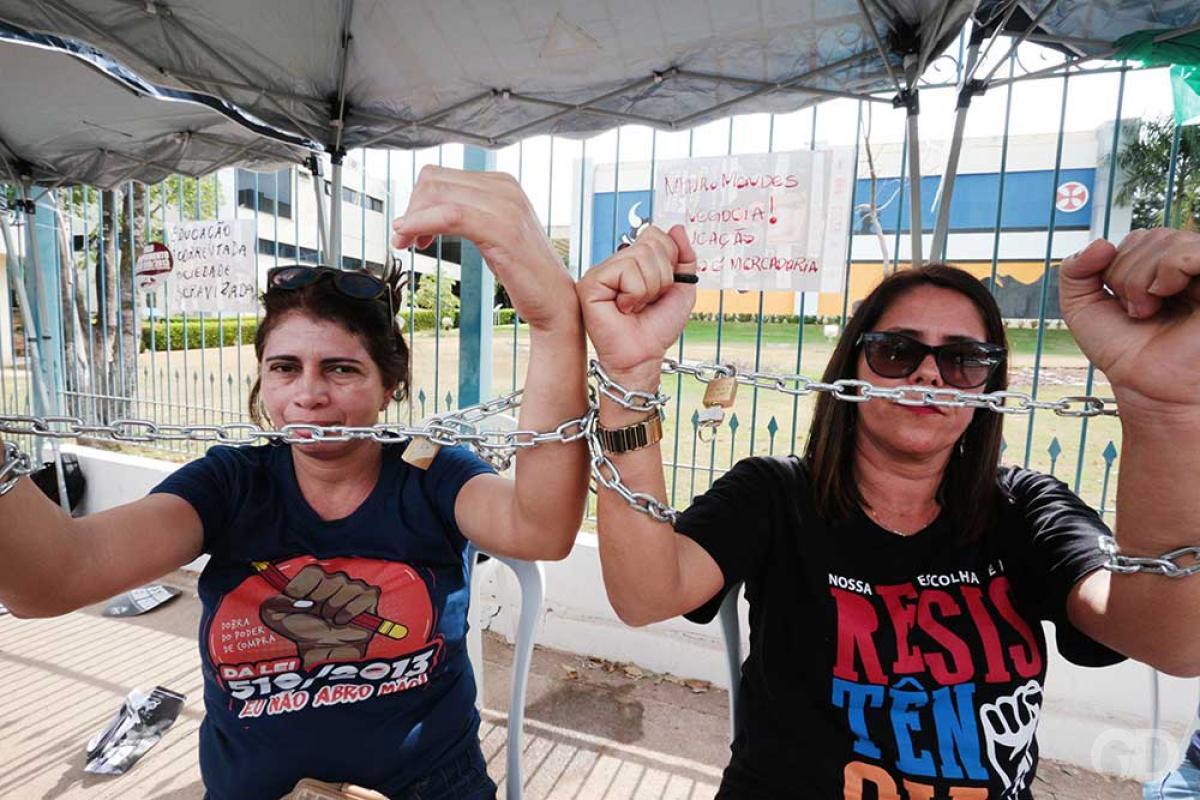 Um grupo de servidores protesta em frente ao Palácio Paiaguás. Alguns se acorrentam às grades da sede do governo e começam uma greve de fome.