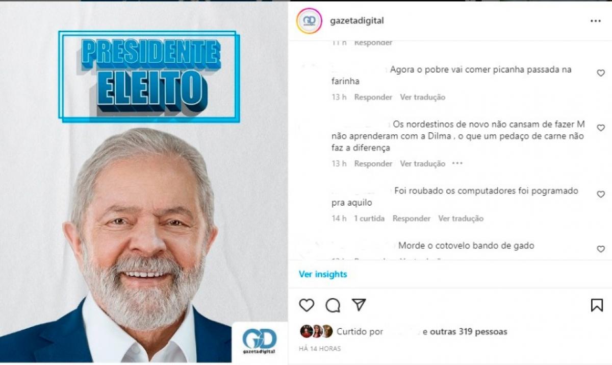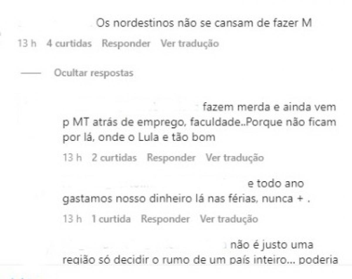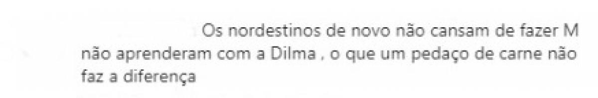 "Os nordestinos, de novo, não cansam de fazer merda, não aprenderam nada com a Dima, tudo isso por um pedaço de carne que não faz a diferença", pontuou. Outro declarou "povo nordestino mais uma vez mostrando sua asneira".