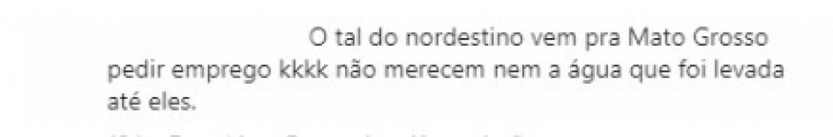Em uma das mensagens, um dos internautas afirmar que os nordestinos não merecem nem a água que chegou até a região. "O tal do Nordestino vem para Mato Grosso para pedir emprego (risos) não merecem nem a água que chegaram até eles".