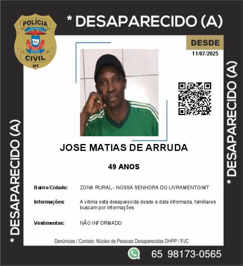 Familiares de José Matias de Arruda, 49, pedem ajuda para localizá-lo. O homem mora sozinho, na zona rural de Campina de Baixo, em Nossa Senhora do Livramento (40 km de Cuiabá), e está desaparecido há 7 dias, quando um vizinho o viu pela última vez na manhã do dia 11.