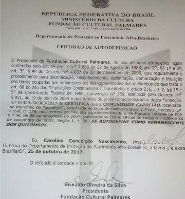 No dia 27 de outubro, a Fundação Palmares certificou o Carretão como área remanescente de quilombolas.