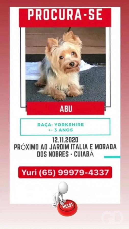 Uma família de Cuiabá oferece recompensa para quem souber notícias que levem ao paradeiro do cachorrinho da raça Yorkshire que atente pelo nome Abu, desaparecido na tarde desta quinta-feira (12), na região do Jd. Itália. O animal tem aproximadamente 3 anos.
