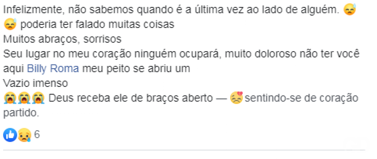 “O céu ganhou mais uma estrela. Billy Você partiu para sempre, mas em nossos corações você viverá eternamente Vou sentir saudades eternas de você. Descanse em paz! Que Deus conforte o coração dos familiares e amigos”, diz outra postagem.