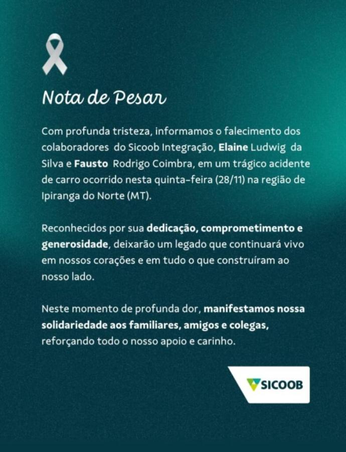 Elaine Ludwig Silva, 36, e Fausto Rodrigo Coimbra, 44, morreram em um grave acidente envolvendo um Gol e uma Fiat Strada na tarde de quinta-feira (28), na MT-242, em Ipiranga do Norte (530 km ao norte de Cuiabá). Vítimas eram funcionários da cooperativa Sicoob.