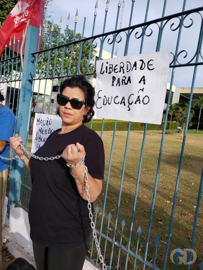 Servidores da educação em greve protestam na manhã desta segunda-feira (22) em frente ao Palácio do governo, na Capital. Um grupo de manifestantes se acorrentou às grades da sede do Executivo para reivindicar o cumprimento da lei de carreira.