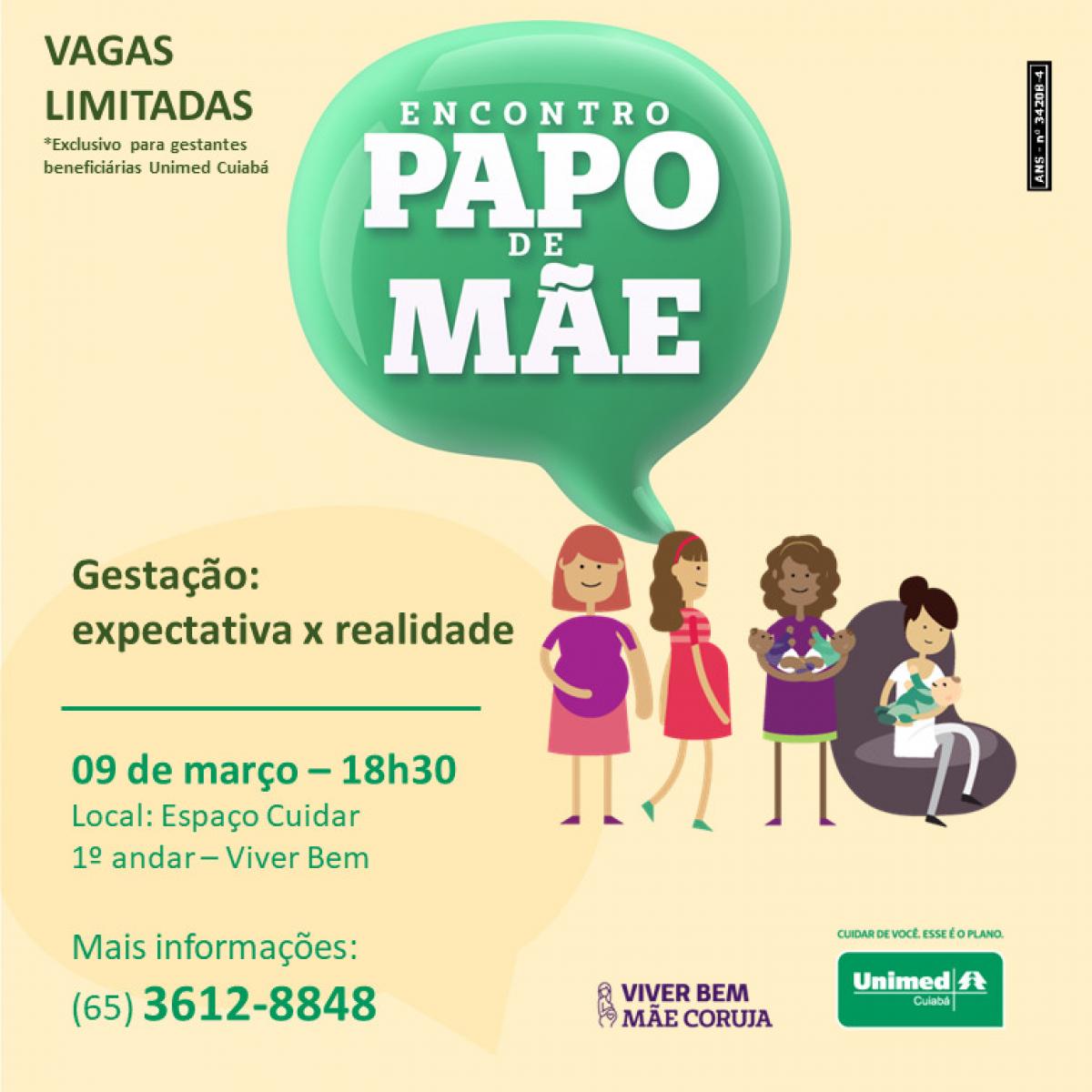 Com o objetivo de promover apoio às mães e debater os aspectos emocionais da gestação, o Programa Mãe Coruja, desenvolvido pelo Núcleo de Medicina Preventiva da Unimed Cuiabá – Viver Bem, realiza na próxima segunda-feira, dia 09 de fevereiro, o encontro Papo de Mãe.