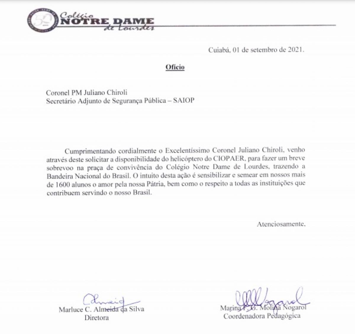 “Na manhã desta quinta-feira (02.09), como parte das atividades da Semana da Pátria realizada pelo Colégio Notre Dame anualmente, o Ciopaer realizou um sobrevoo no local, a pedido da própria instituição educacional, conforme ofício em anexo;