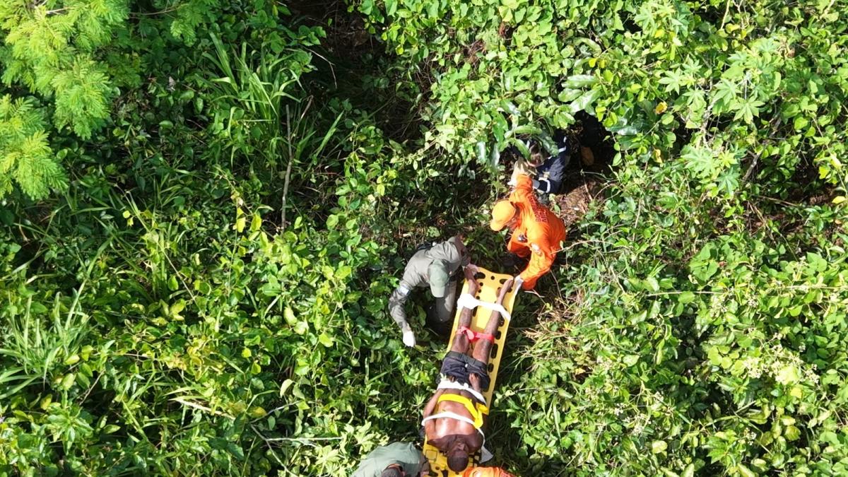 A vítima foi encontrada bastante debilitada, porém consciente e com vida, recebendo atendimento no local antes de ser encaminhada para avaliação médica.