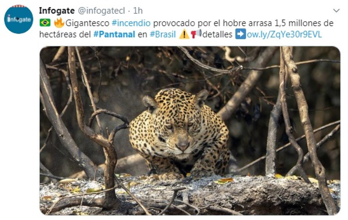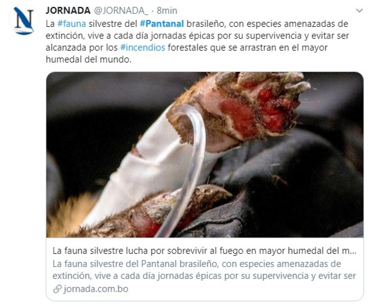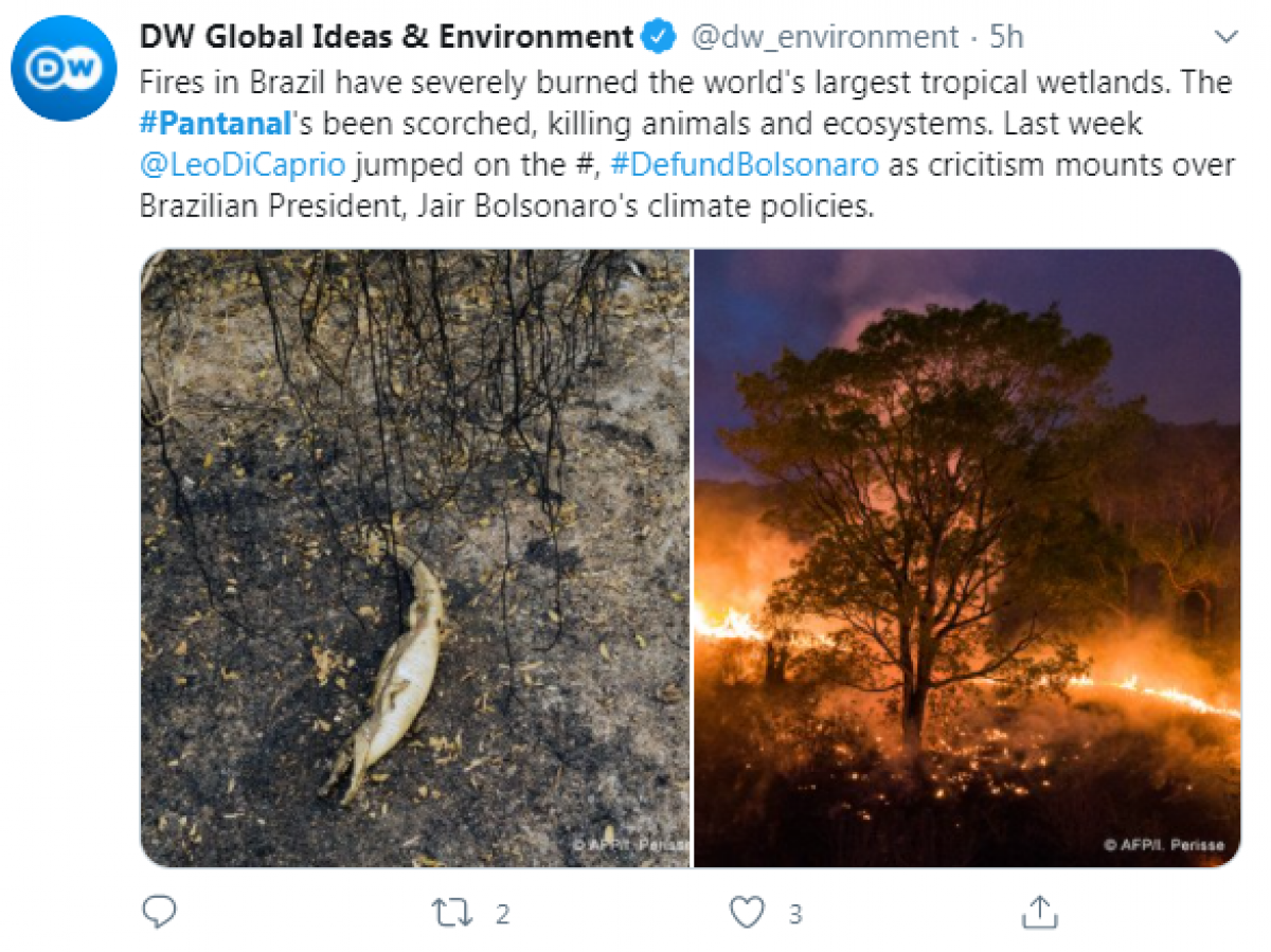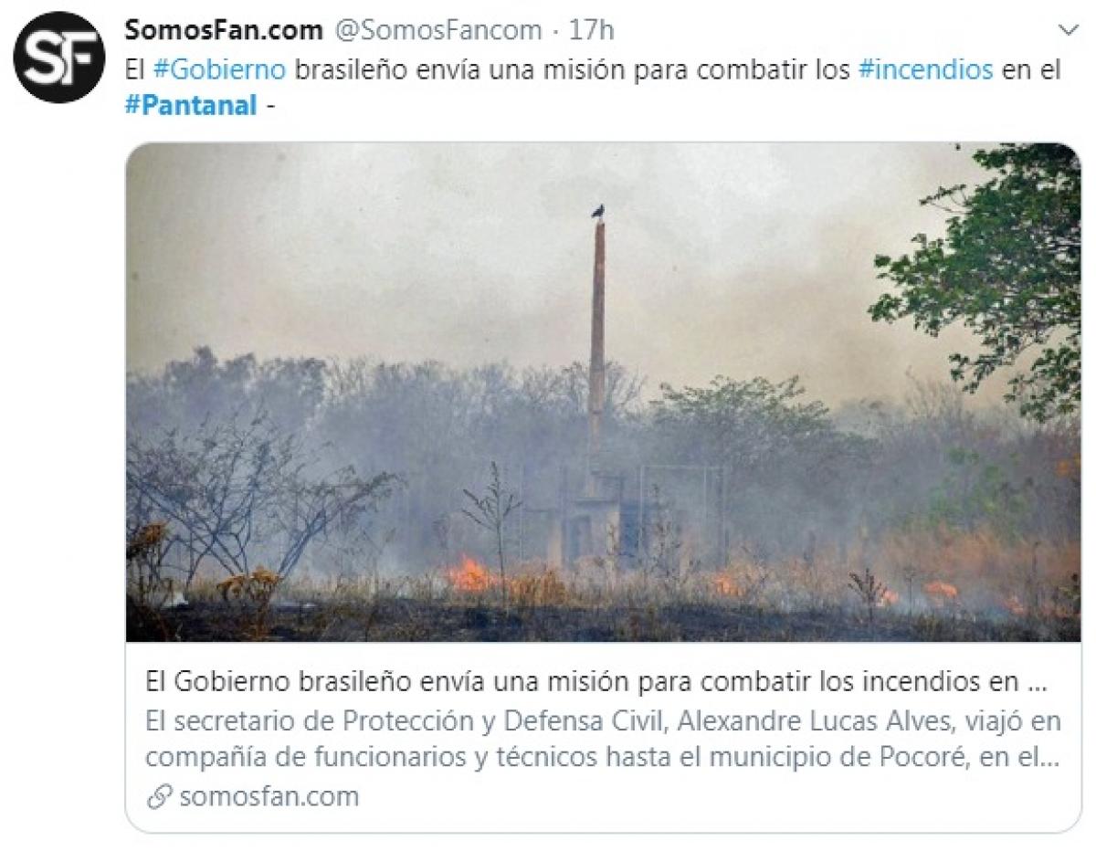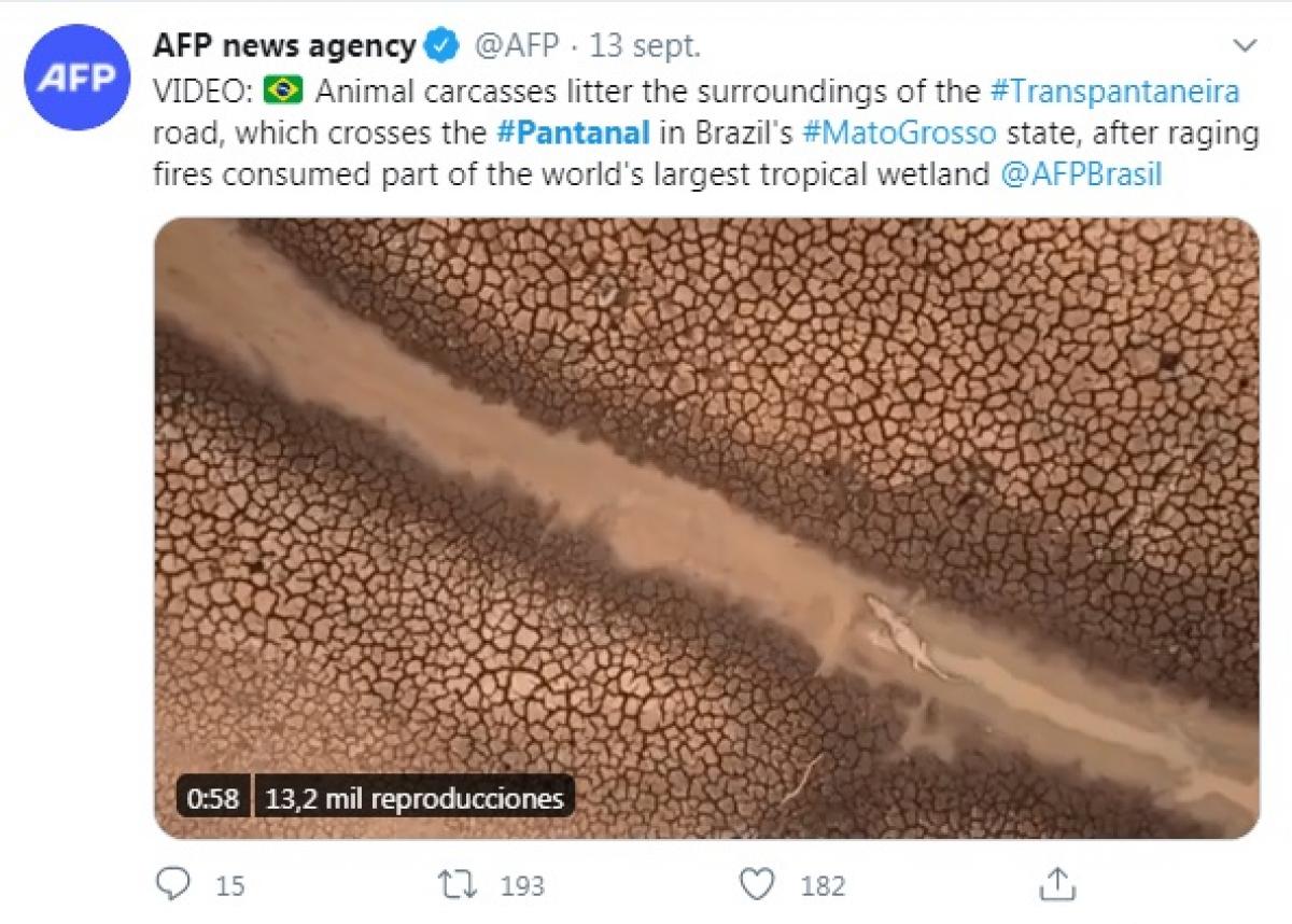 Com 1,9 milhão de seguidores, a agência de notícias francesa AFP publicou um vídeo que mostra a destruição dos incêndios ao longo da rodovia Transpantaneira, na região de Poconé (104 km ao sul de Cuiabá). Em menos de 24 horas, as imagens com as carcaças de animais tiveram mais a de 13,4 mil visualizações na conta do Twitter da AFP.