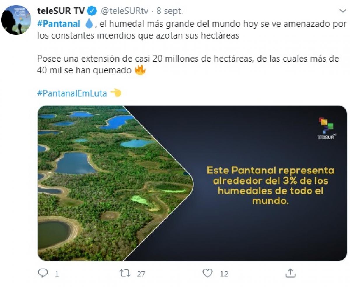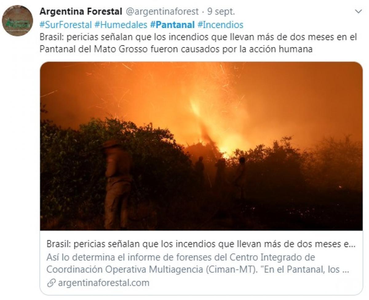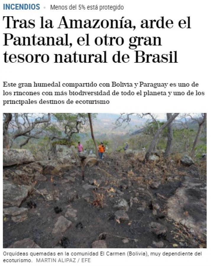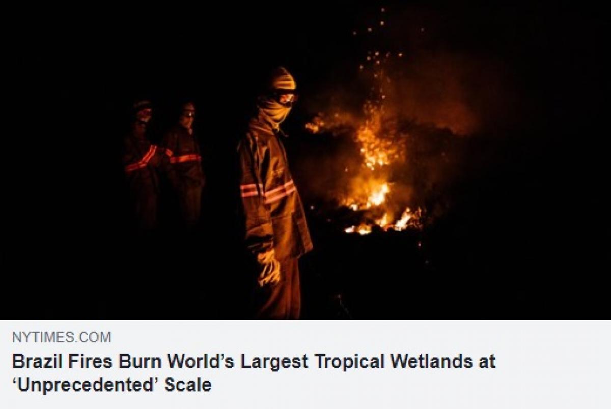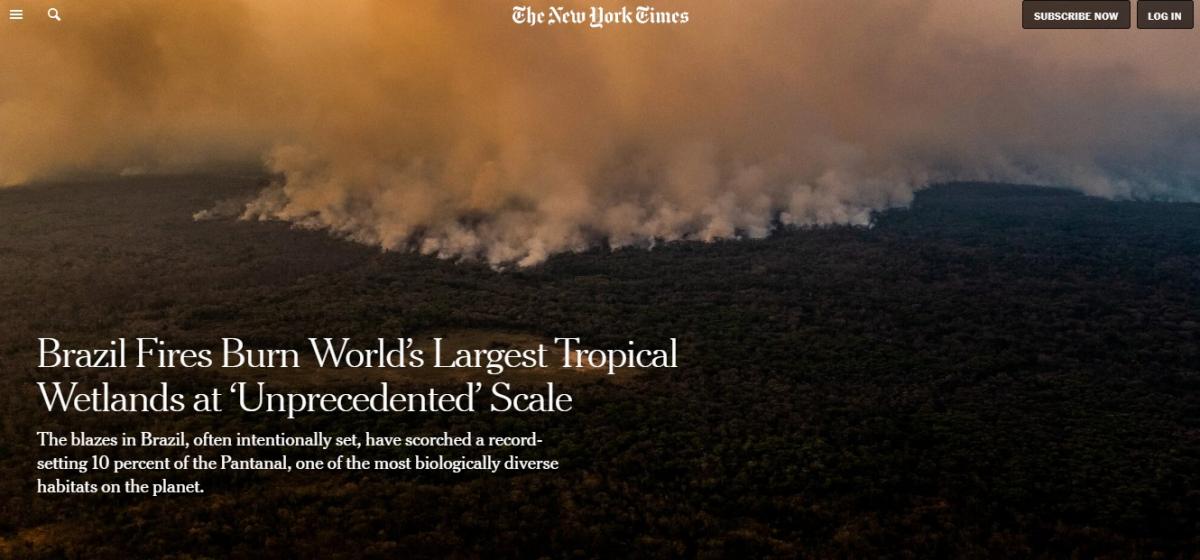 Desde julho o Pantanal mato-grossense tem sido destruído pelso incêndios. Segundo o Centro Nacional de Prevenção e Combate (Prevfogo), no estado foram queimadas 1,2 milhão de hectares, o equivalente a mais de 168 milhões de campo de futebol. O desastre ambiental de grandes proporções foi destaque na imprensa internacional. Sites como o New York Times, dos Estados Unidos, The Guardian, do Reino Unido, e El Mundo, da Espanha, estão entre os veículos que repercutiram o desastre ambiental.
