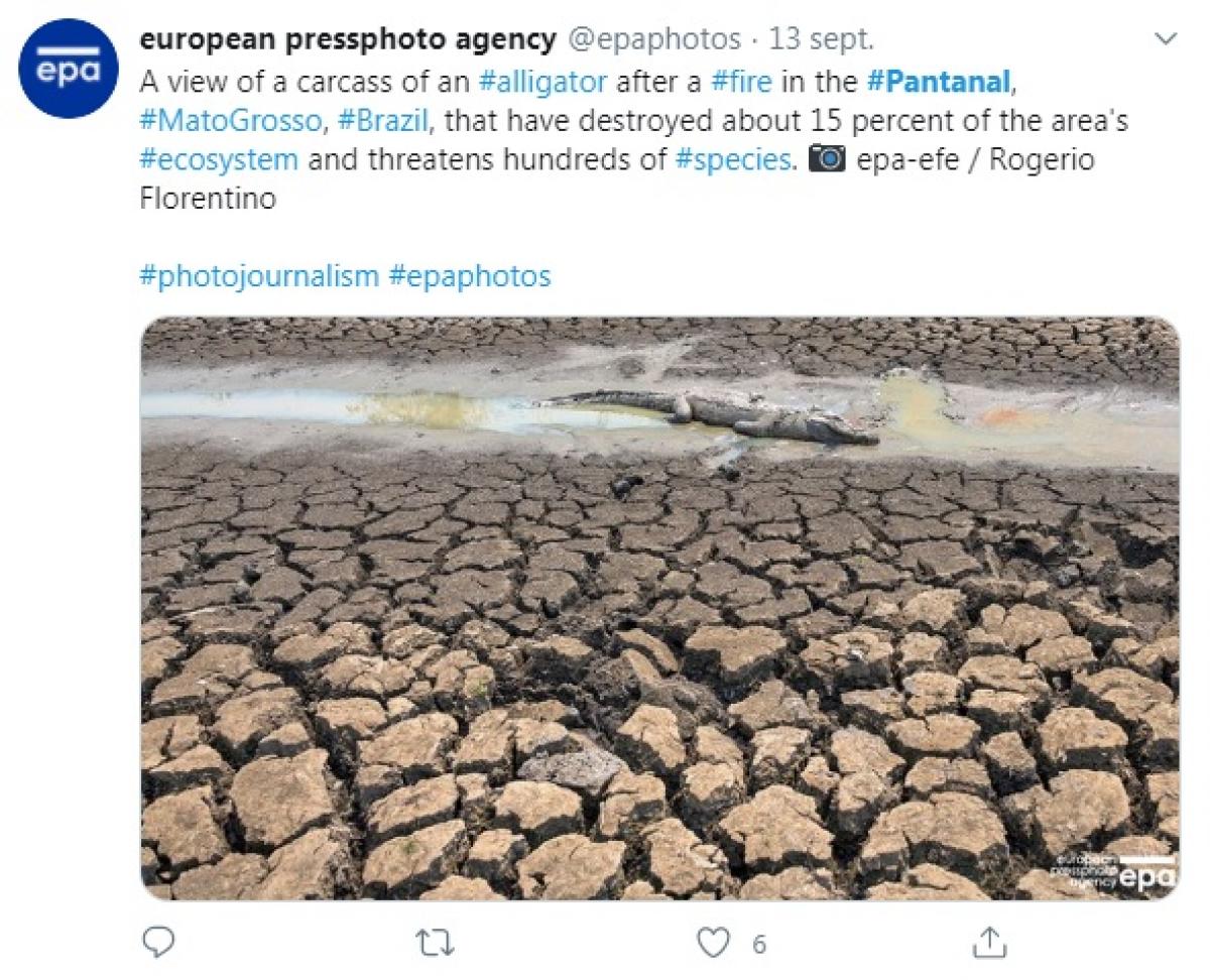 As carcaças de animais mortos, mais especificamente de um jacaré, também foram destaque na European Pressphoto Agency, que postou em seu Twitter no domingo (13) a situação do bioma em Mato Grosso. "Vista da carcaça de um jacaré após um incêndio no pantanal, Mato Grosso, Brasil, que destruiu cerca de 15% do ecossistema da área e ameaça centenas de espécies".
