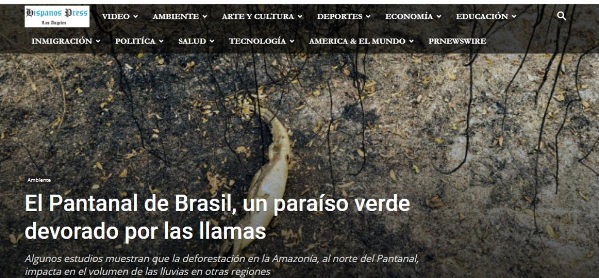 O site Hispano Press, de Los Angeles (EUA), descreve o Pantanal como "um paraíso verde devorado pelas chamas", em uma reportagem especial. "Crocodilos queimados, vegetação reduzida a cinzas, chamas que destroem tudo em seu caminho: A Pantana brasileira enfrenta uma catástrofe sem paralelo, com danos irreparáveis à diversidade da maior umidade tropical do planeta".
