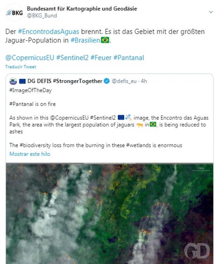 O alemão BKG postou uma foto de satélite dos focos de incêndios no Pantanal. "O Encontro das Águas está pegando fogo. É a área com a maior população de onças do Brasil".