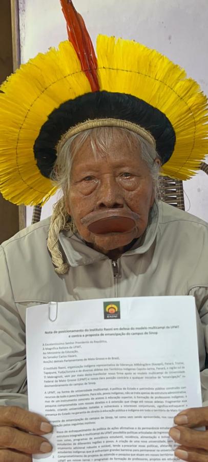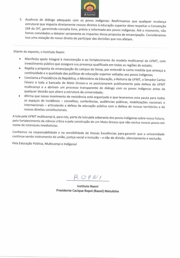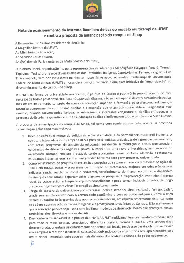 O Instituto Raoni, organização indígena reconhecida internacionalmente, emitiu uma nota de posicionamento contra a separação do campus de Sinop da Universidade Federal de Mato Grosso (UFMT) (500 km ao Norte de Cuiabá). A Nota foi endereçada à presidência da República, à Reitoria da UFMT, ao Ministério da Educação, aos parlamentares de Mato Grosso e ao senador Carlos Fávaro (PSD), um dos autores da proposta de desmembramento.