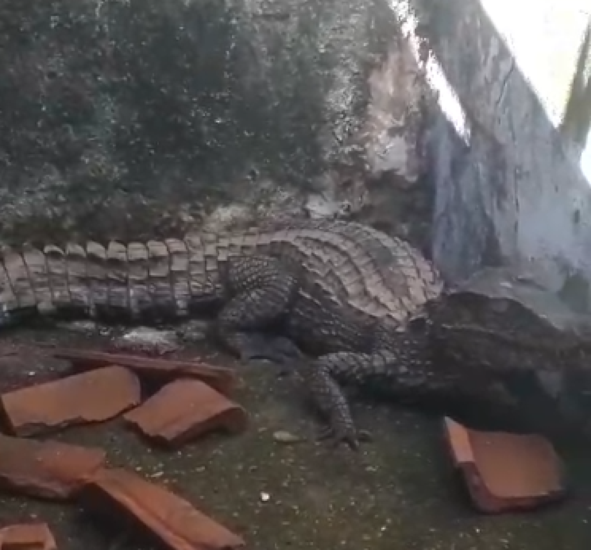Vídeo mostra o momento em que o animal aparece encurralado através do portão, aos fundos de uma casa, com diversas telhas quebradas ao seu redor. Ele está imóvel e não apresenta ferimentos visíveis.