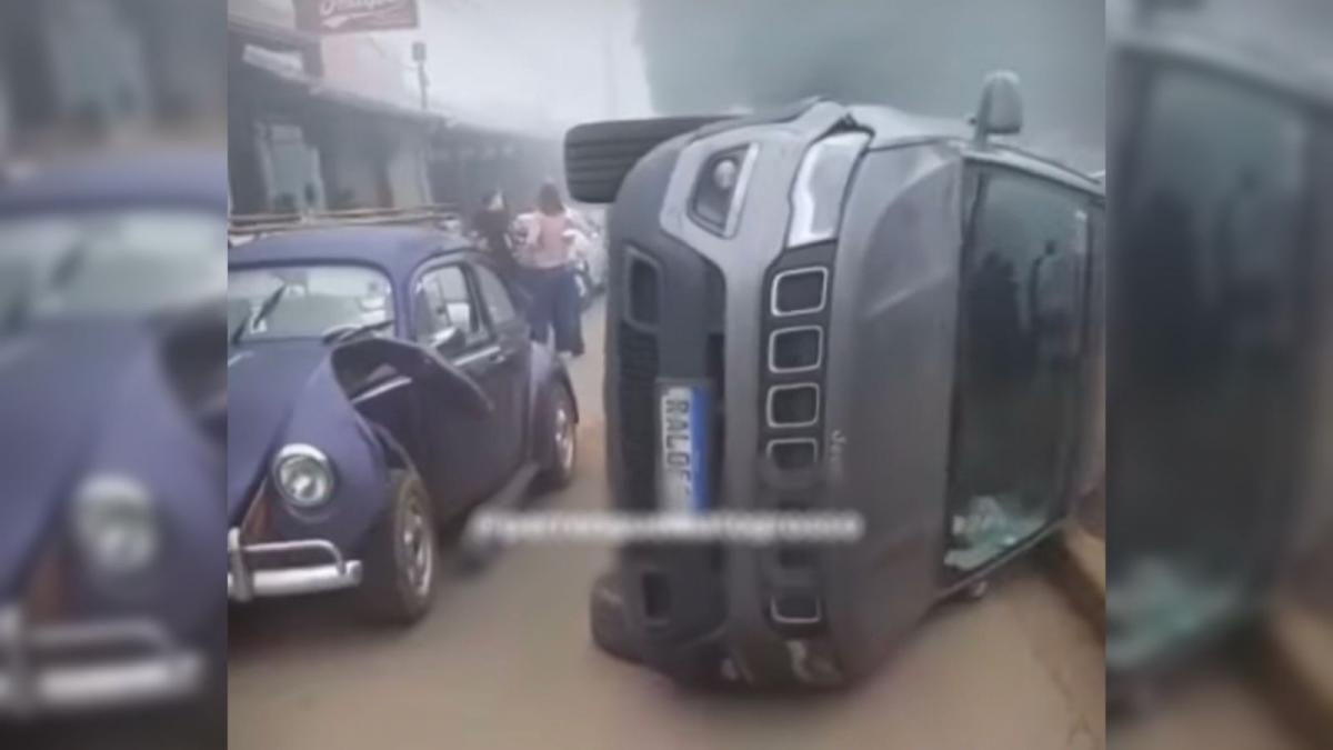 Um Jeep Renegade cinza acabou tombando após colidir com um fusca azul no centro de Chapada dos Guimarães (67 km ao norte de Cuiabá), neste domingo (7).