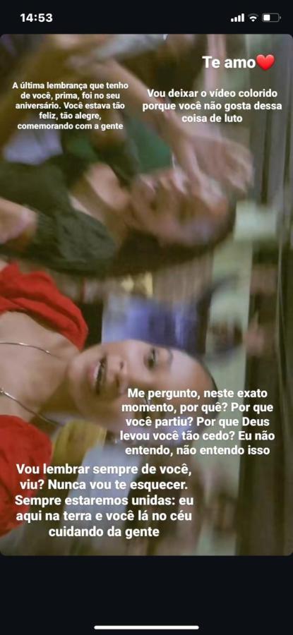 Em outro post, Ludmilla lembrou do aniversário de Maria Clara, comemorado na última segunda-feira (1). “A última lembrança que tenho de você, prima, foi no seu aniversário. Você estava tão alegre, comemorando com a gente. Me pergunto por quê? Por que você partiu? Por que Deus tão cedo? Vou lembrar sempre de você. Sempre estaremos unidas: eu aqui na terra e você lá no céu cuidando da gente”.