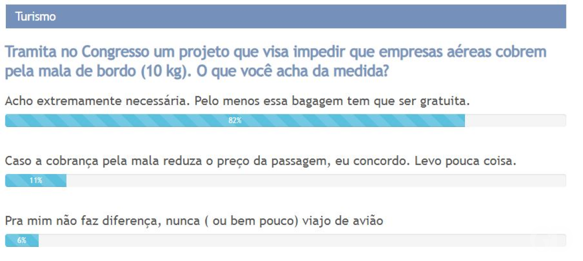 De acordo com a enquete, 82% dos participantes consideram a medida “extremamente necessária”, defendendo que pelo menos a mala de bordo, de até 10 quilos, deve ser gratuita. Outros 11% afirmaram concordar com a cobrança somente se isso reduzir o preço das passagens, enquanto 6% disseram que a mudança não faz diferença, já que viajam pouco ou nunca de avião.