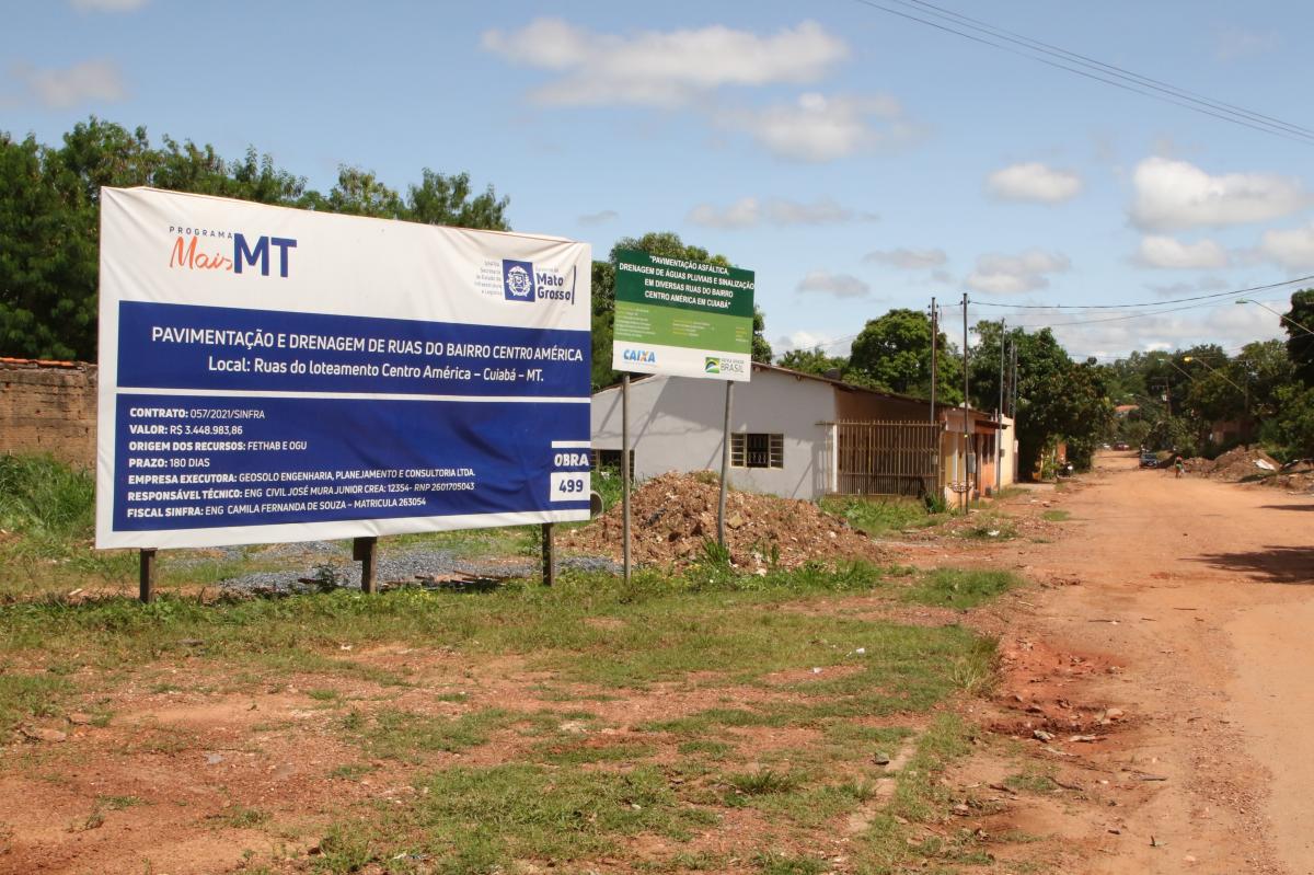 Entre as obras estaduais paralisadas, estão, por exemplo, os trabalhos de pavimentação e drenagem de 22 ruas do bairro Centro América, em Cuiabá, lançados em 2018 pelo valor de R$ 2,5 milhões, com recursos oriundos do governo do Estado e do Ministério das Cidades, com previsão de entrega em 2019.