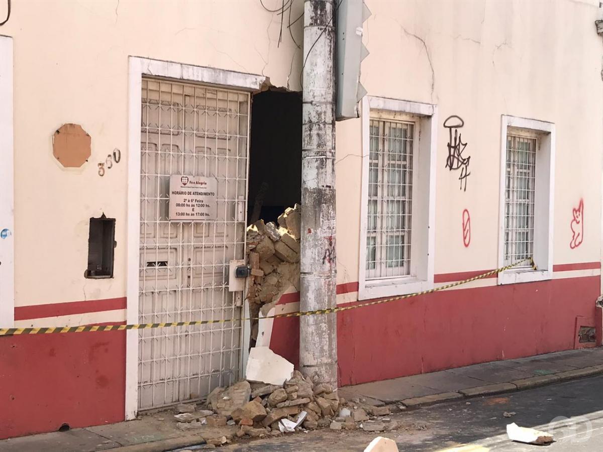 Ainda há riscos de um novo desabamento. A parede está com rachaduras e parte da estrutura desabada está apoiada a um poste.