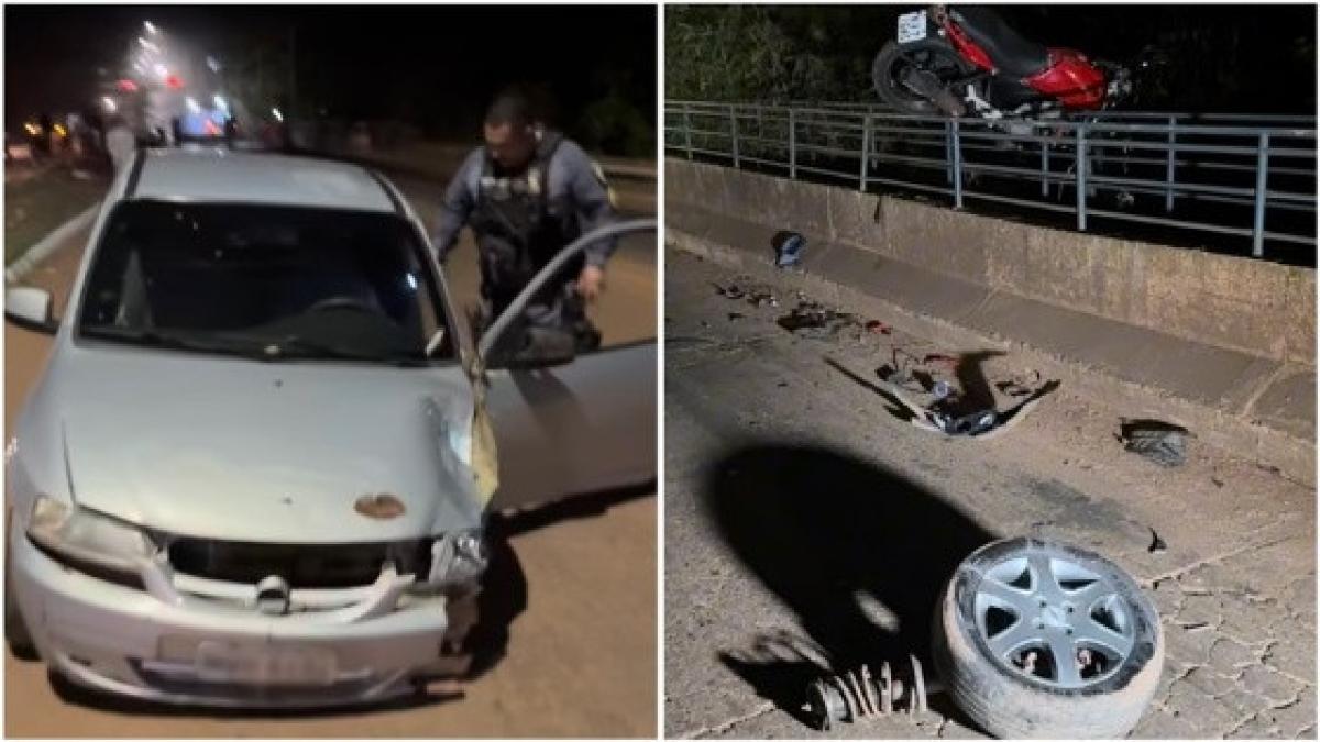 Com o impacto, a motocicleta foi arremessada em cima da passarela de pedestres da ponte e o motociclista caiu logo à frente.