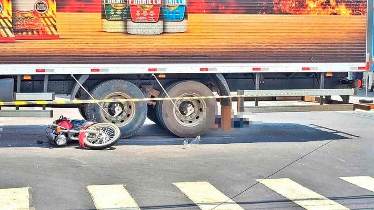 Com o impacto, a vítima e a moto foram parar em baixo do veículo de carga.