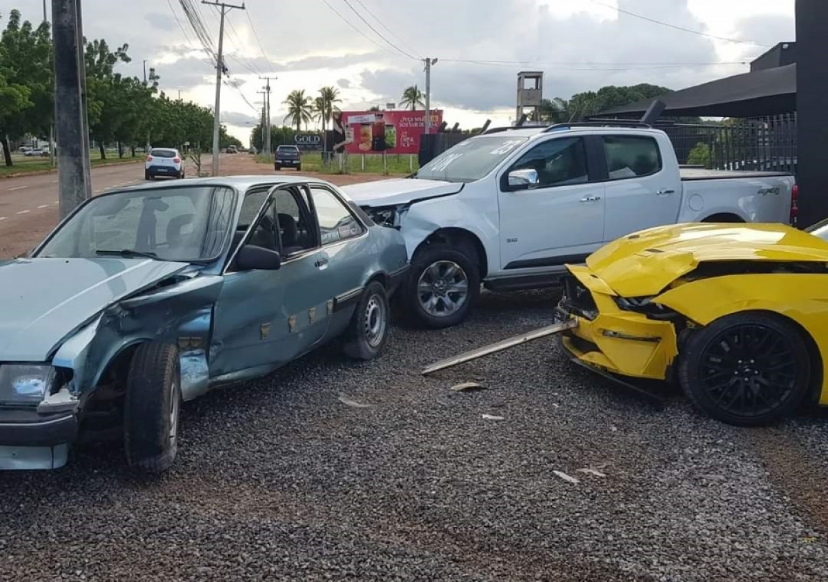 A caminhonete S10 e o Mustang tiveram a parte frontal danificadas, enquanto a Chevettte ficou com a lateral e traseira amassados.