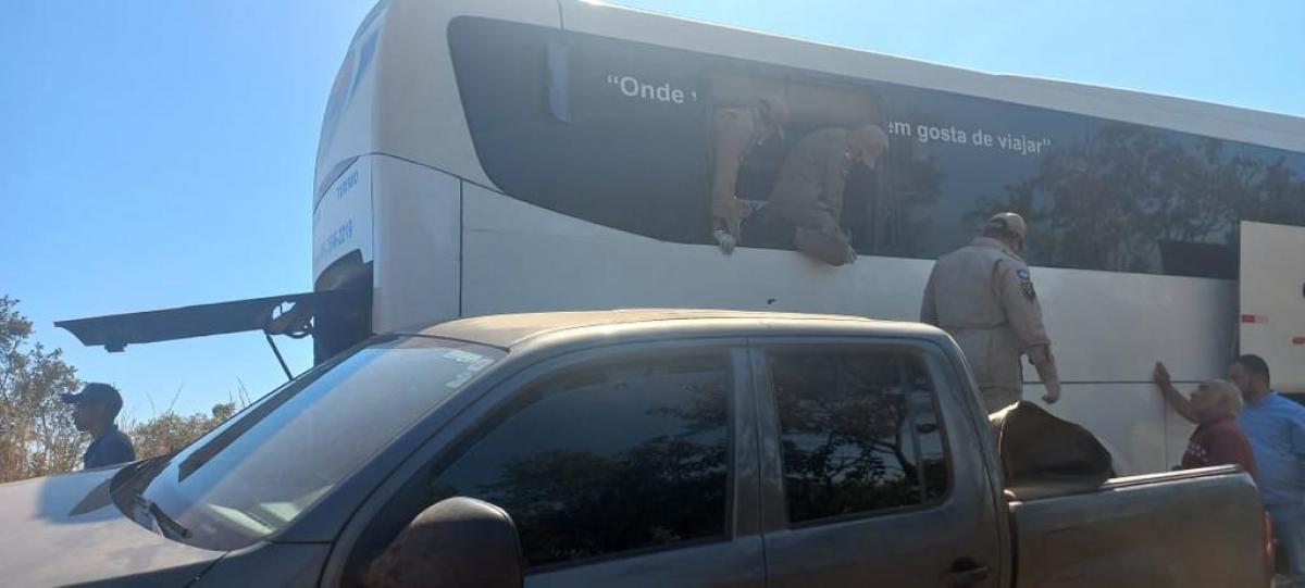 Equipes da Perícia Oficial de Identificação Técnica (Politec), são aguardadas para realizar o atestado de óbito do motorista do ônibus, e assim, os bombeiros conseguirem retirá-lo das ferragens.