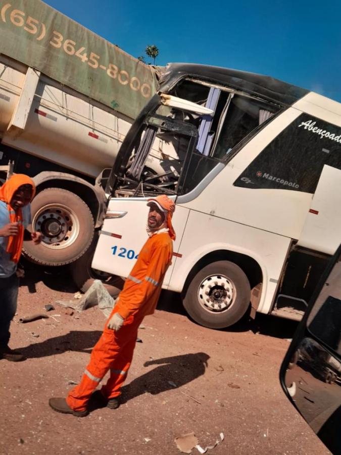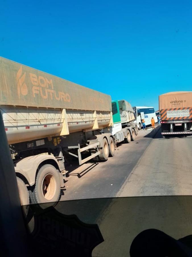 Conforme informações, o trânsito estava parado no trecho, quando o condutor do veículo de passageiros da Viação Juína bateu na traseira da carreta da empresa Bom Futuro. Devido ao impacto, esta ainda atingiu outro veículo de carga, da mesma empresa, que estava parado a frente.