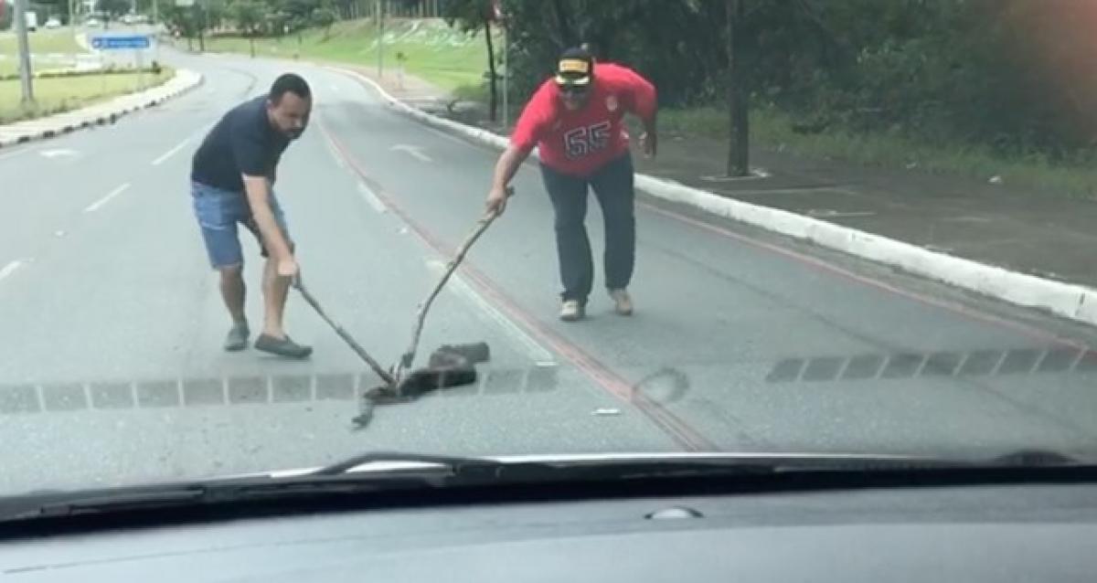 Como a cobra não chegava ao outro lado, dois motoristas usaram galhos de árvores para conduzir o animal até área do parque, de onde ela deve ter saído. Depois do procedimento, o trânsito voltou ao normal.