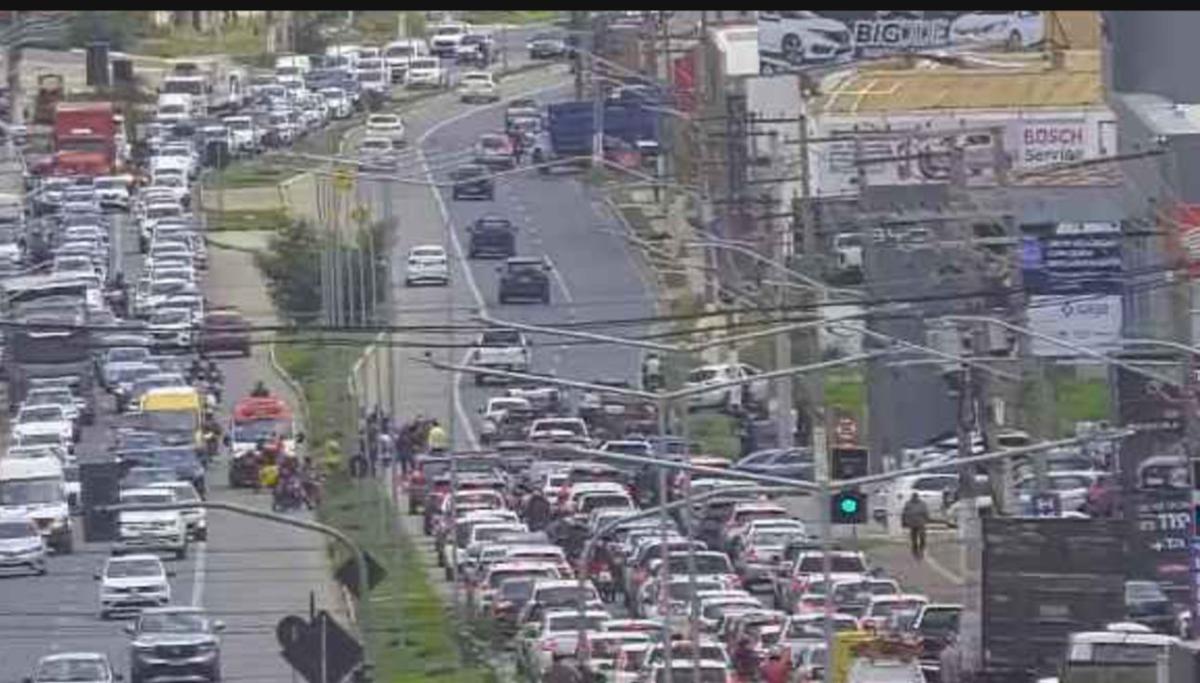 O trânsito está totalmente parado nos dois sentidos da via, travado para quem seguia em direção a Cuiabá e lento para quem vinha no sentido oposto.