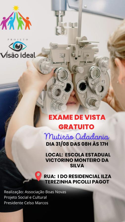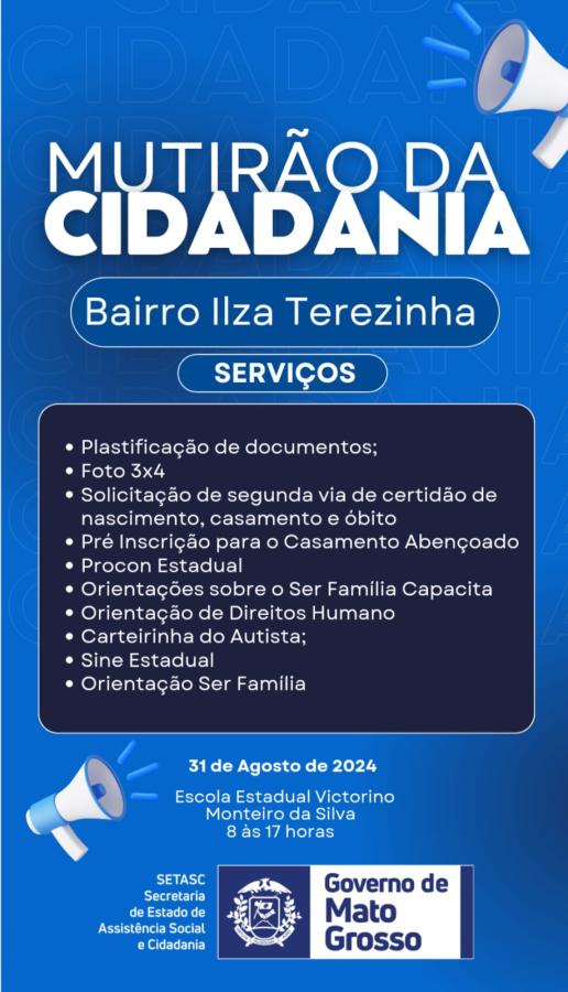 O Mutirão da Cidadania acontece neste sábado (31) na Escola Estadual Victorino Monteiro da Silva, localizada no bairro Ilza Terezinha, em Cuiabá. Os cidadãos terão acesso a inúmeros serviços de documentação e também a exame de vista gratuito, ofertado pelo Projeto Visão Ideal. As ações terão início às 8 horas e irão até às 17 horas.
