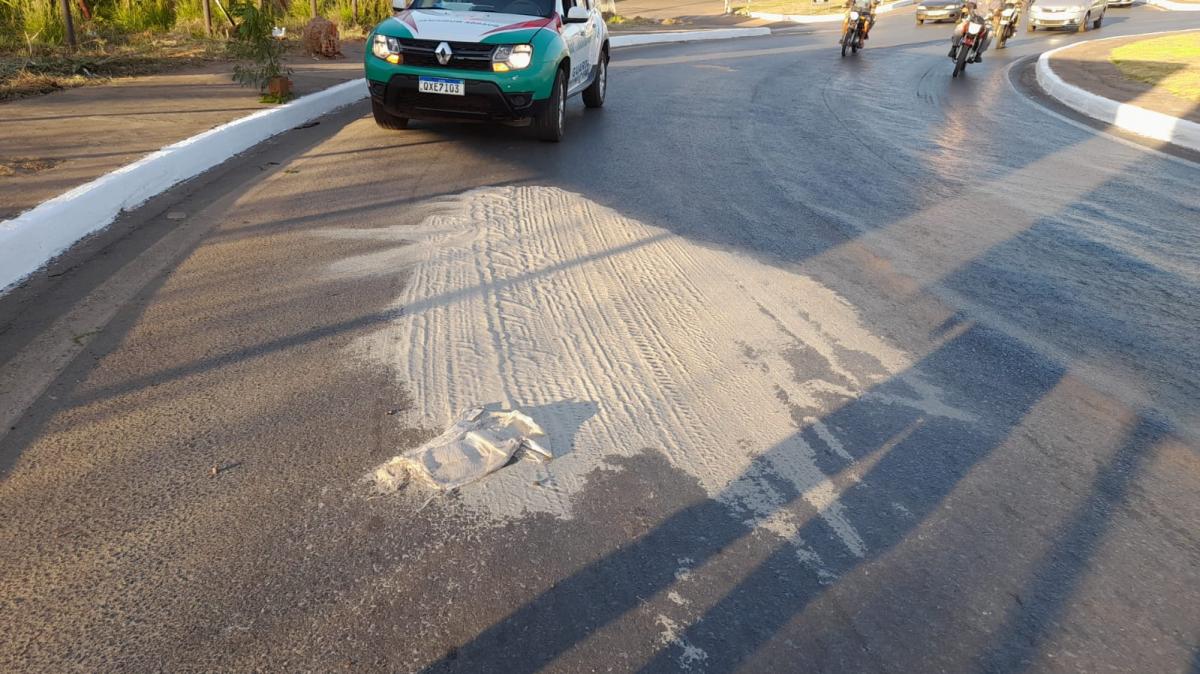Segundo informações da Guarda Municipal de Várzea Grande, um caminhão carregado que passou no início da manhã, derrubou o saco e, com a queda, o pó espalhou por todo o asfalto.
