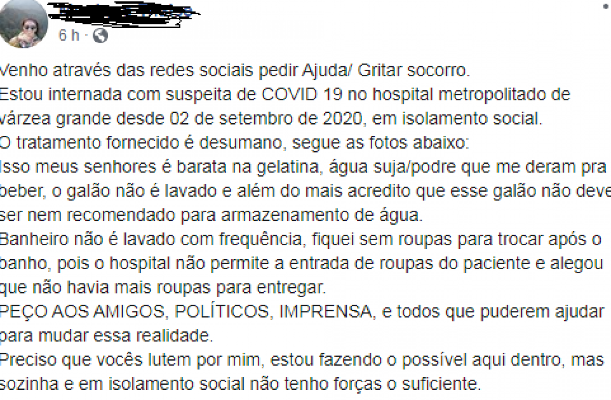 Ela pede socorro para denunciar a situação e chama a atenção dos amigos, imprensa e políticos. "O tratamento fornecido é desumano", diz ela ao postar várias fotos atribuídas ao Hospital Metropolitano.