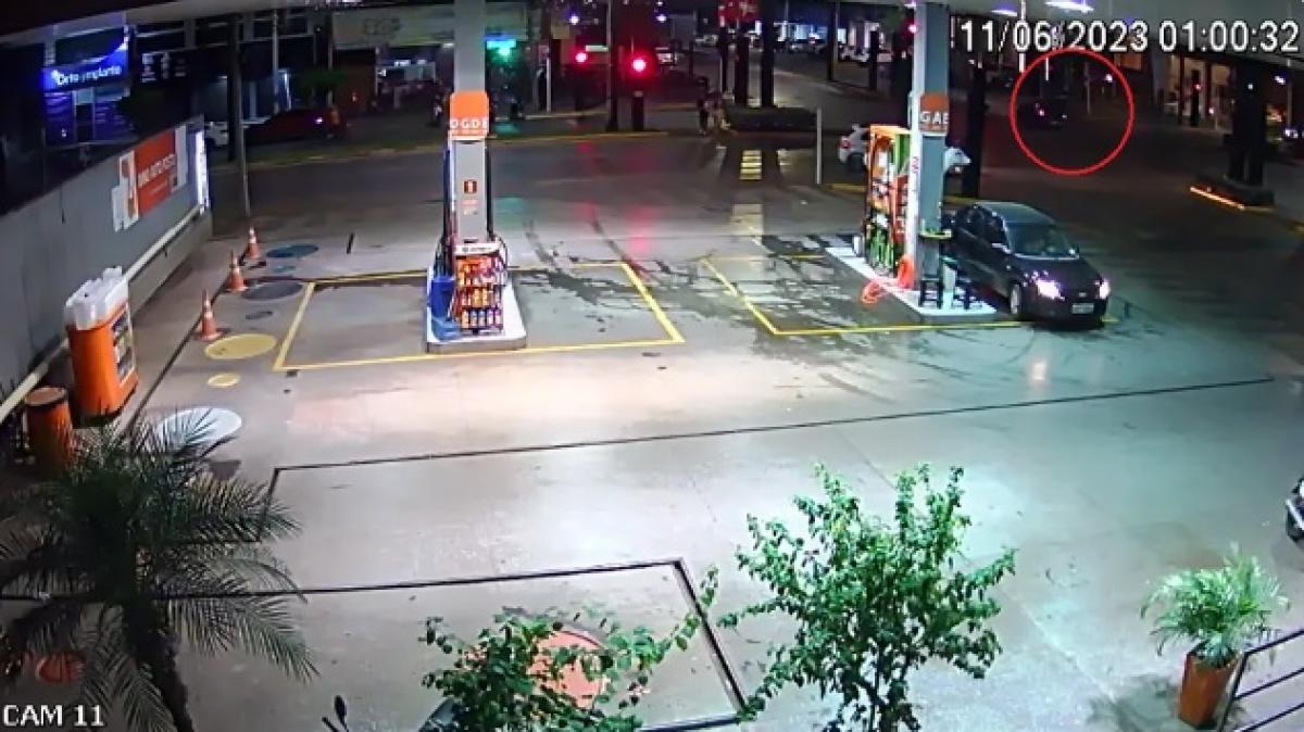 Funcionários de um posto de combustível relataram que o motorista do carro fez uma conversão proibida e atingiu o casal na moto.