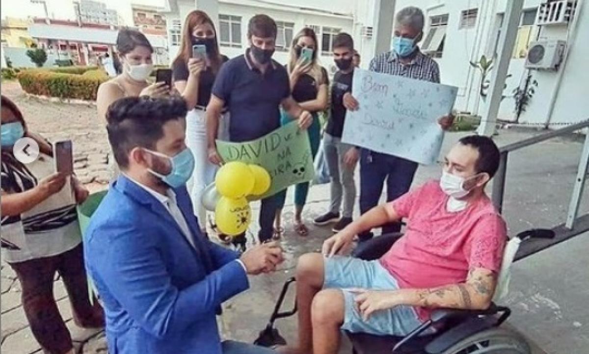 O vendedor David José Carvalho da Cunha tem vários motivos para comemorar. Ele recebeu uma segunda chance de viver, após lutar 38 dias contra a covid-19 e teve a mais amorosa surpresa que poderia protagonizar. Vestido com um blazer azul, o técnico de enfermagem Douglas dos Anjos Nascimento de Oliveira se ajoelhou e abriu a caixinha de veludo, como manda os melhores romances. O pedido: você quer casar comigo, veio acompanhado de emoção e palmas de quem presenciava a cena.