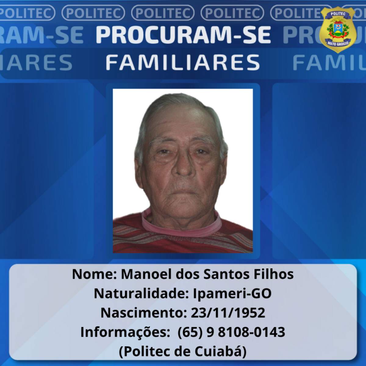 Em Várzea Grande, o goiano Manoel dos Santos Filho, 72, natural de Ipameri e filho de Joana Gervasio de Avelar, foi encontrado já sem vida em sua residência, no dia 4 de outubro desse ano.