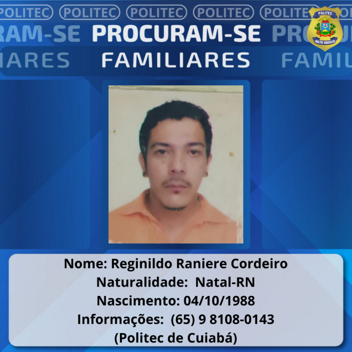 Reginildo Raniere Cordeiro, 37, era natural de Natal (RN) e foi localizado sem vida, vítima de afogamento, no Rio Cuiabá, no dia 4 de outubro desse ano. Cordeiro é filho de Valdenice Cordeiro de Moura.