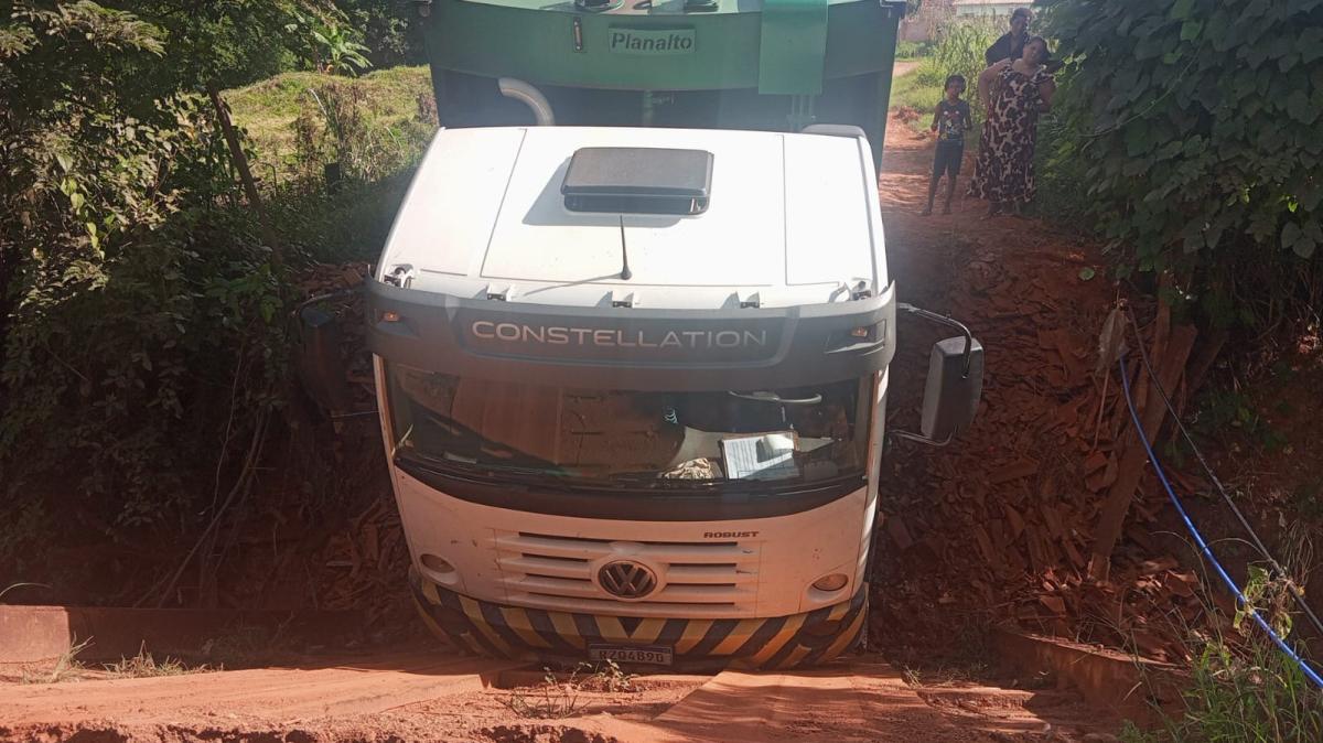 Um caminhão da empresa Locar, responsável pela coleta de lixo em Cuiabá e Várzea Grande, caiu em um córrego na tarde desta quinta-feira (30). O veículo passava por uma ponte de madeira, no bairro Monte Castelo, quando esta cedeu.