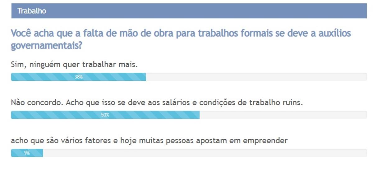 Em votação, 53% dos participantes afirmaram que não concordam com a ideia de que os auxílios governamentais sejam os responsáveis pela dificuldade de contratação. Para esse grupo, o problema está diretamente relacionado à falta de valorização do trabalhador.