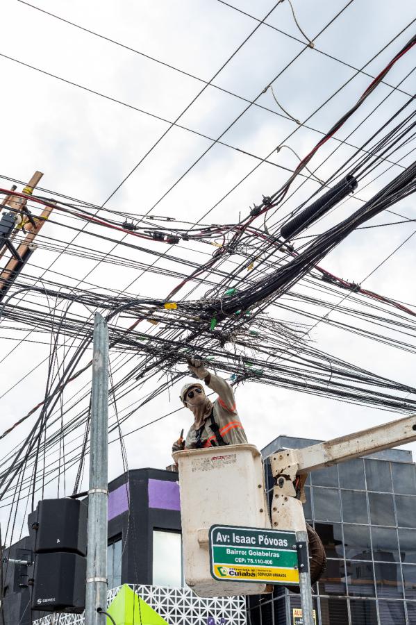 A operação é realizada pela Prefeitura de Cuiabá em parceria com a concessionária de energia Energisa e tem como foco a retirada de fios soltos, cabos abandonados e estruturas irregulares dos postes. A ação marca o início de um cronograma de organização da fiação aérea na região central.