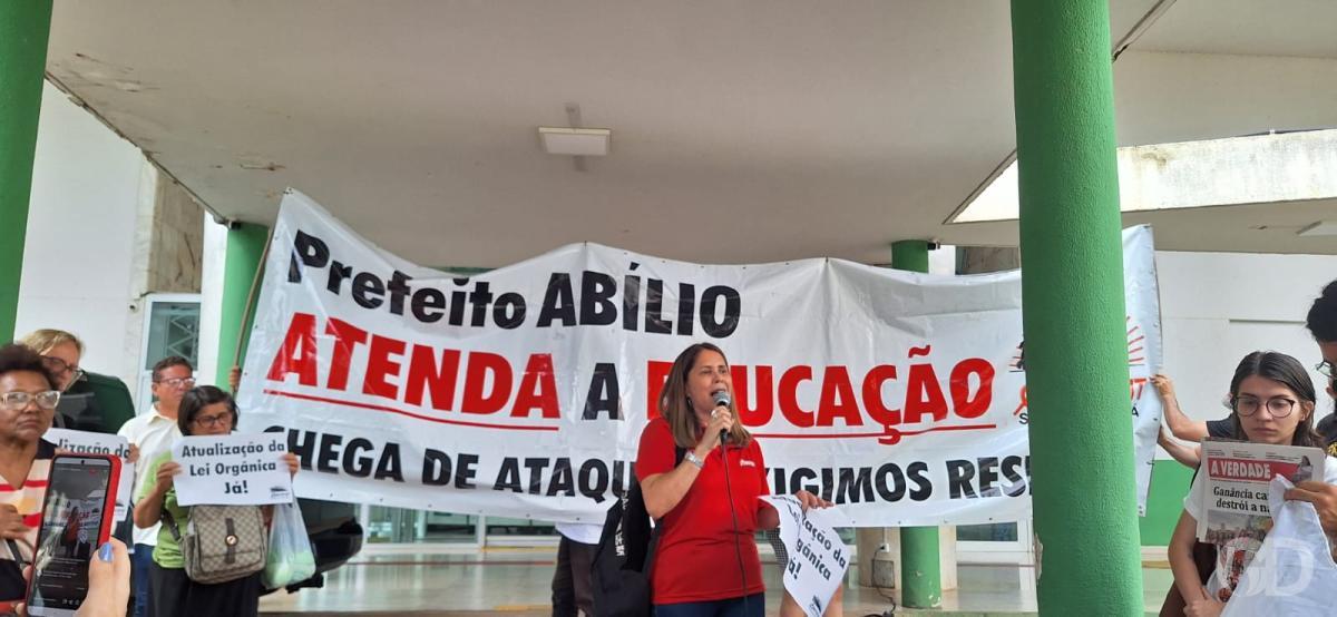 O Sindicato dos Trabalhadores no Ensino Público de Mato Grosso (Sintep-MT), sede Cuiabá, realizou um ato nesta terça-feira (18) em frente ao Palácio Alencastro. A categoria cobra respostas do prefeito Abilio Brunini (PL) sobre reivindicações como revisão salarial conforme carreira.