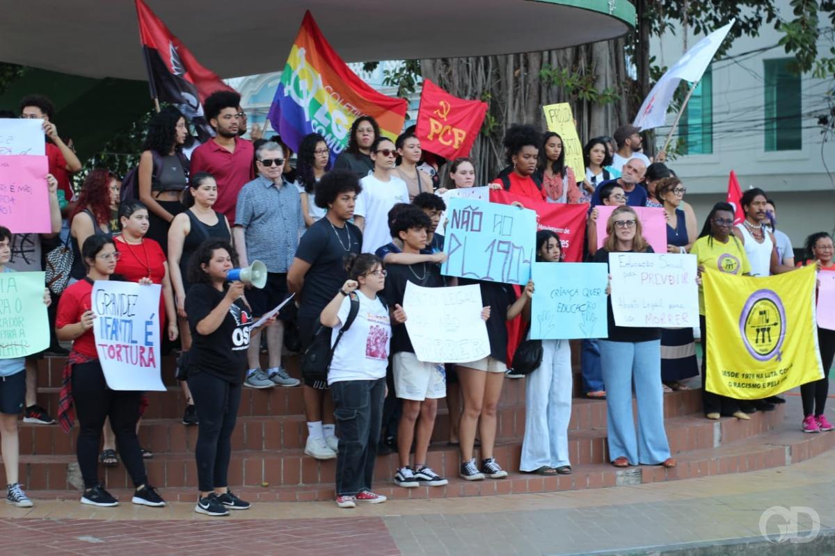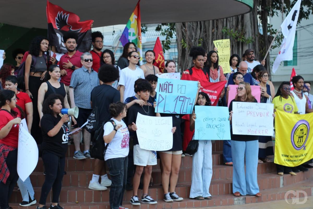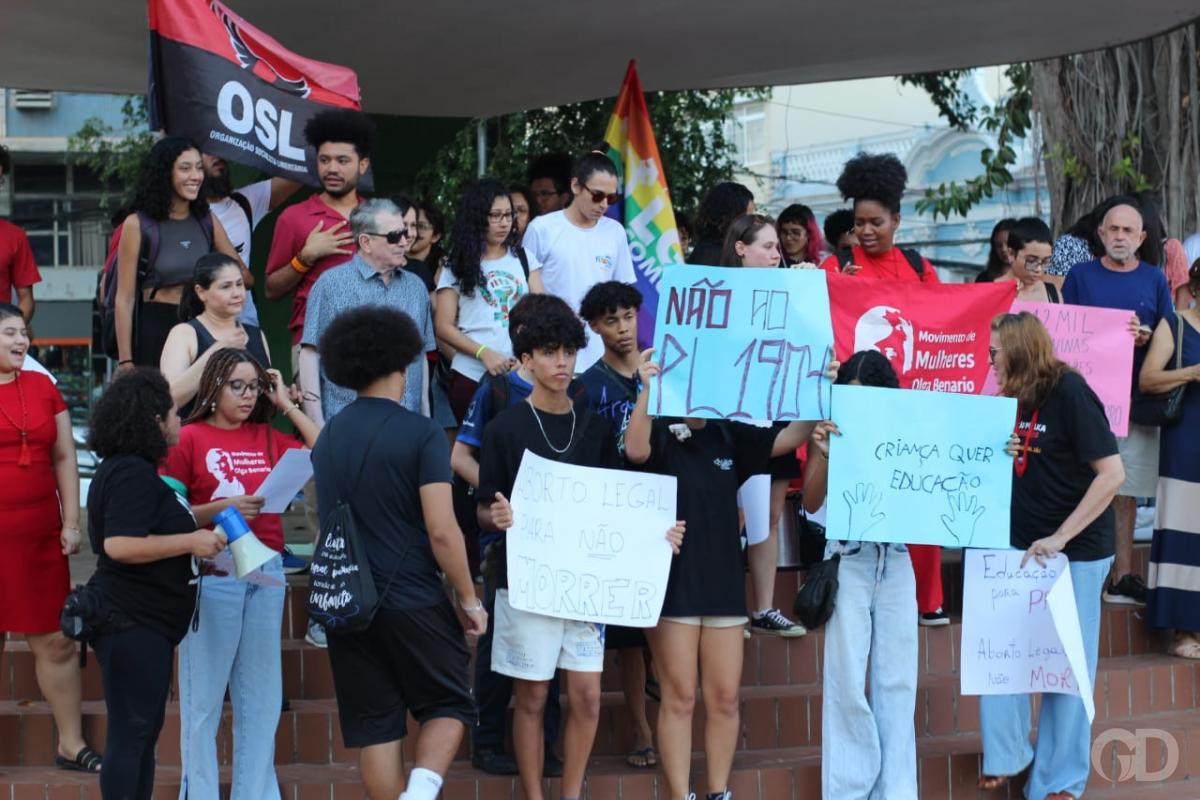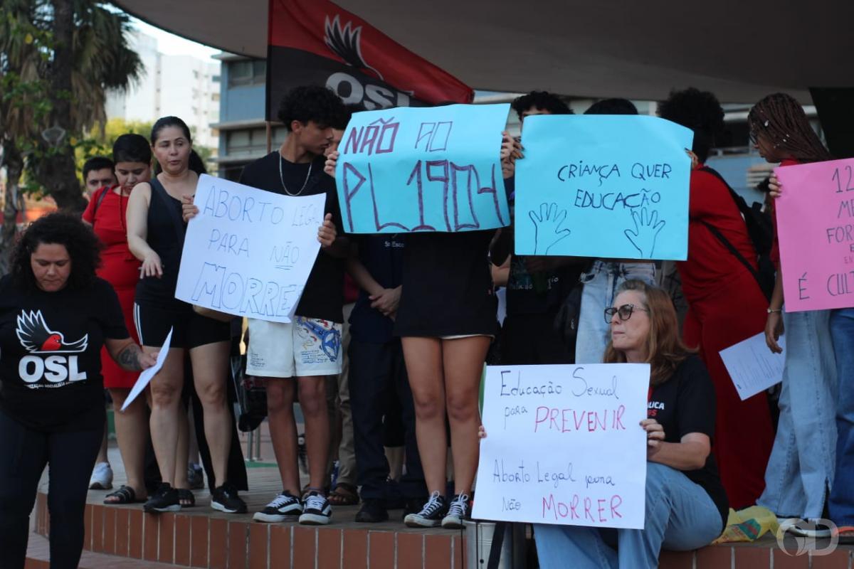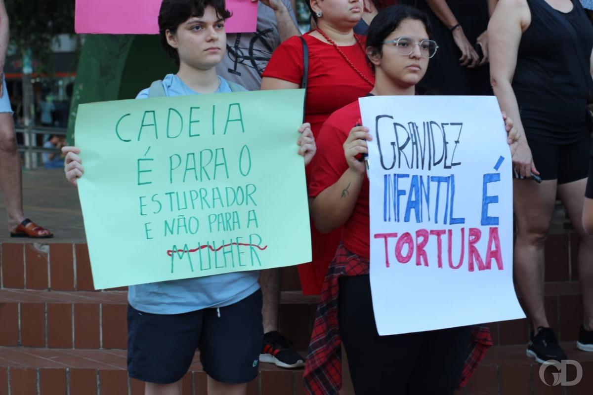 Manifestantes contrários ao PL 1904, conhecido como "Projeto do Estupro", protestaram na tarde desta segunda-feira (17) na praça Alencastro, em frente a Prefeitura de Cuiabá. O grupo é contra a aprovação do texto que iguala a pena para mulheres que interromperem a gestação após as 22 semana a do homicídio, que prevê pena de até 20 anos.