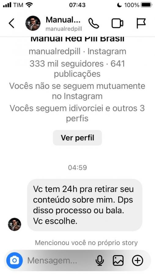 O vídeo ficou famoso e chegou até o coach que não levou na brincadeira. Ele mandou uma mensagem direta (DM) via rede social para Lívia na qual dizia: “Você tem 24 horas para retirar seu conteúdo sobre mim. Depois disso é processo ou bala. Você escolhe”.