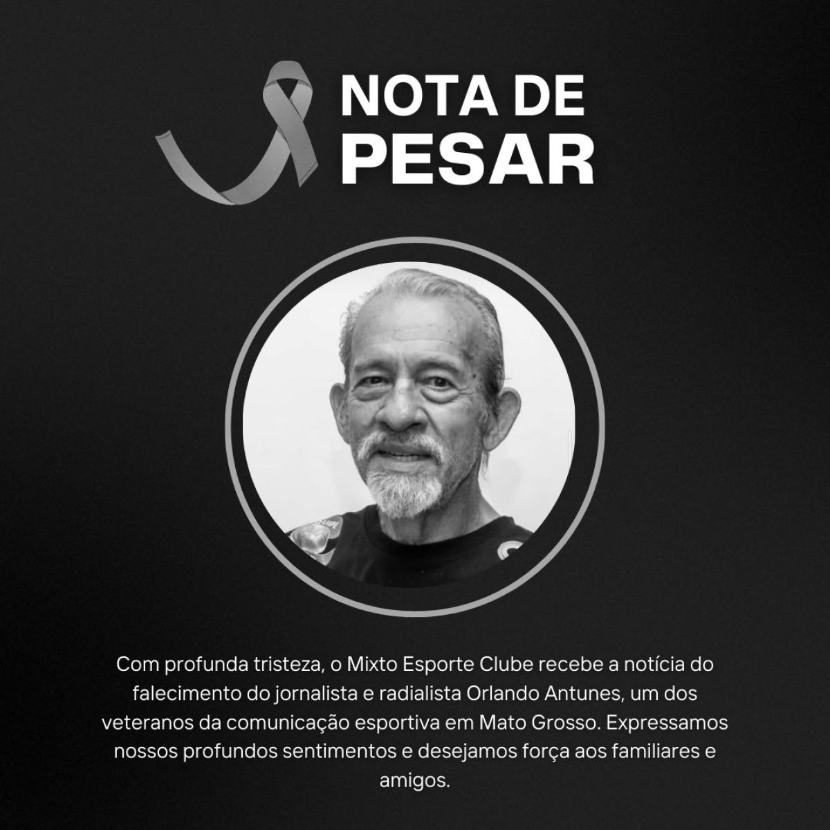 Com profunda tristeza, o Mixto Esporte Clube recebe a notícia do falecimento do jornalista e radialista Orlando Antunes, um dos veteranos da comunicação esportiva em Mato Grosso.