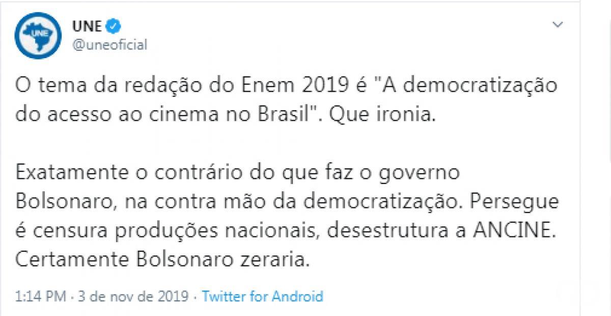 O ministro da Educação, Abraham Weintraub, utilizou seu perfil no Twitter para divulgar o tema. "Vou dar um furo para vocês que me pediram esses dias qual é o tema da redação: Democratização do acesso ao cinema no Brasil. Esse é o tema", escreveu.